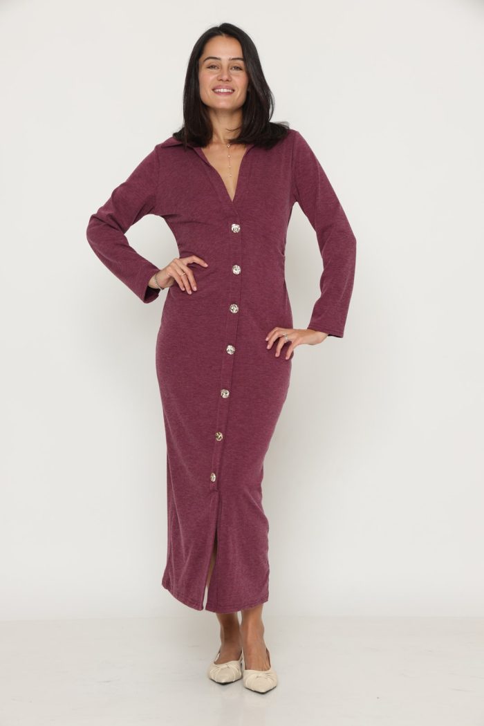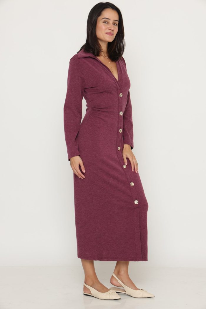 שמלה סריג מקסי כפתור זהב בורדו