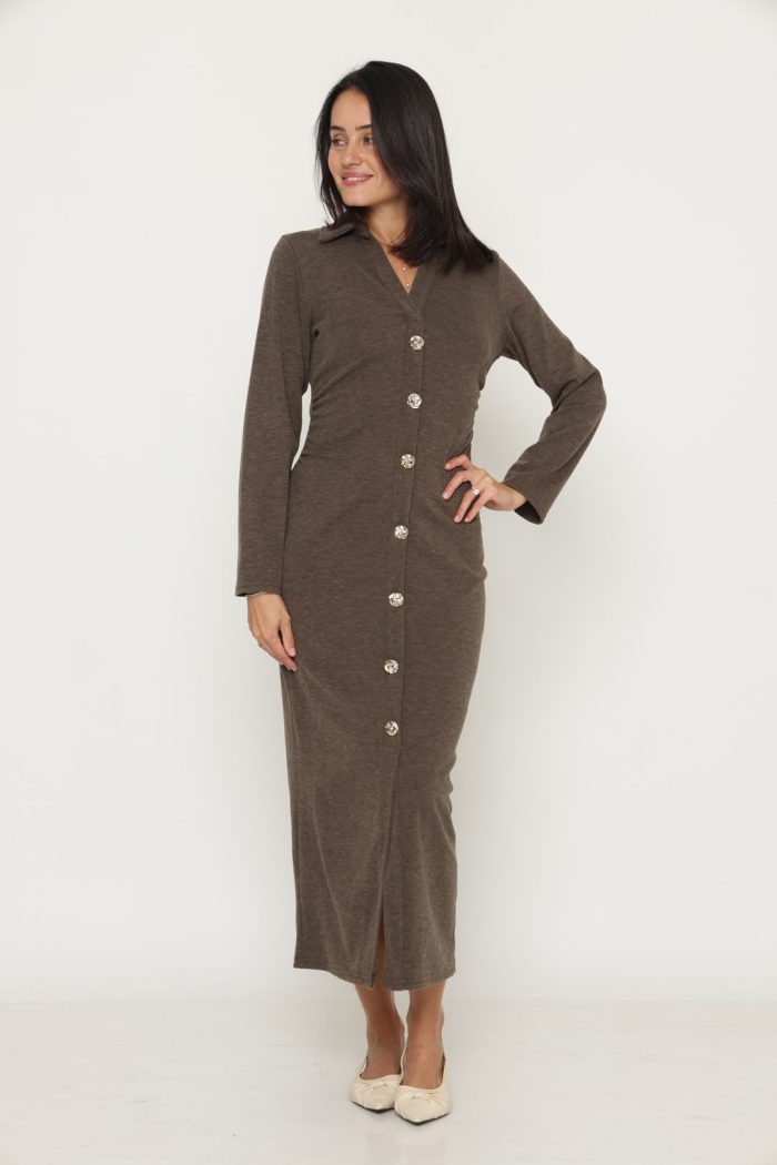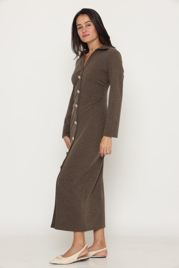 שמלה סריג מקסי כפתור זהב חומה