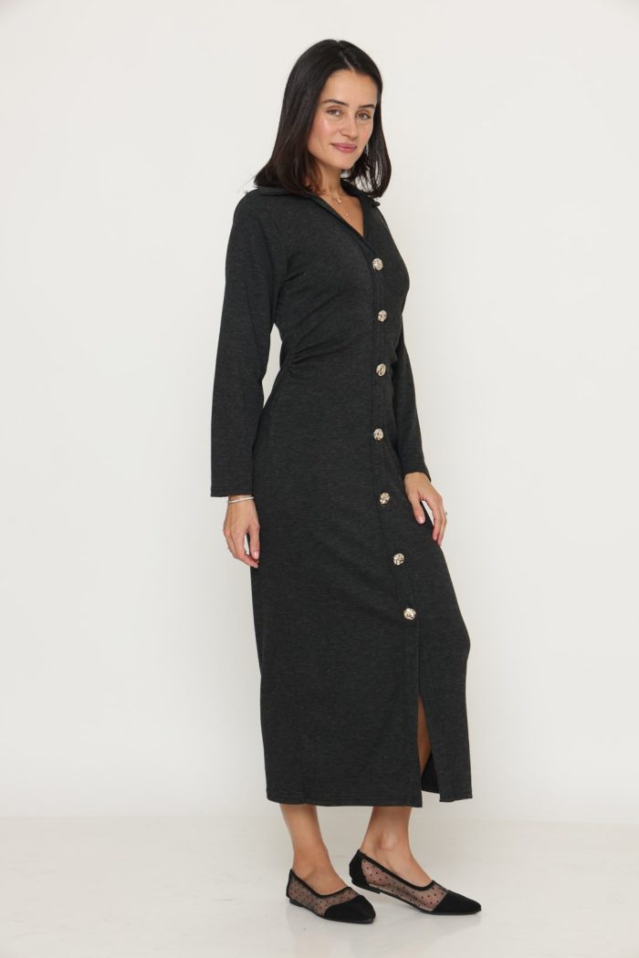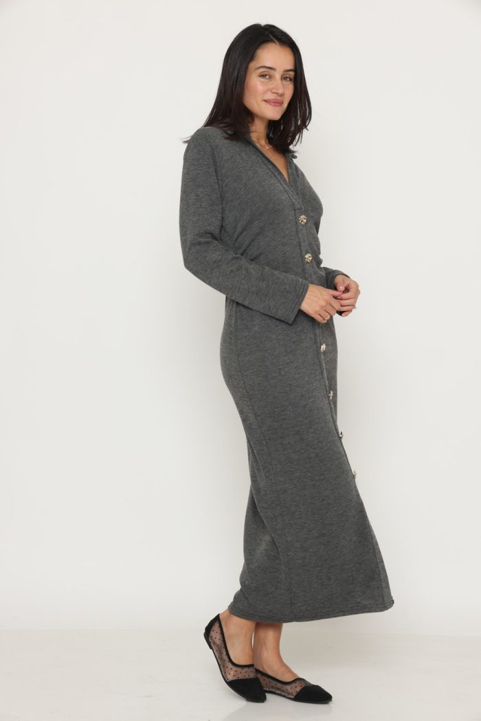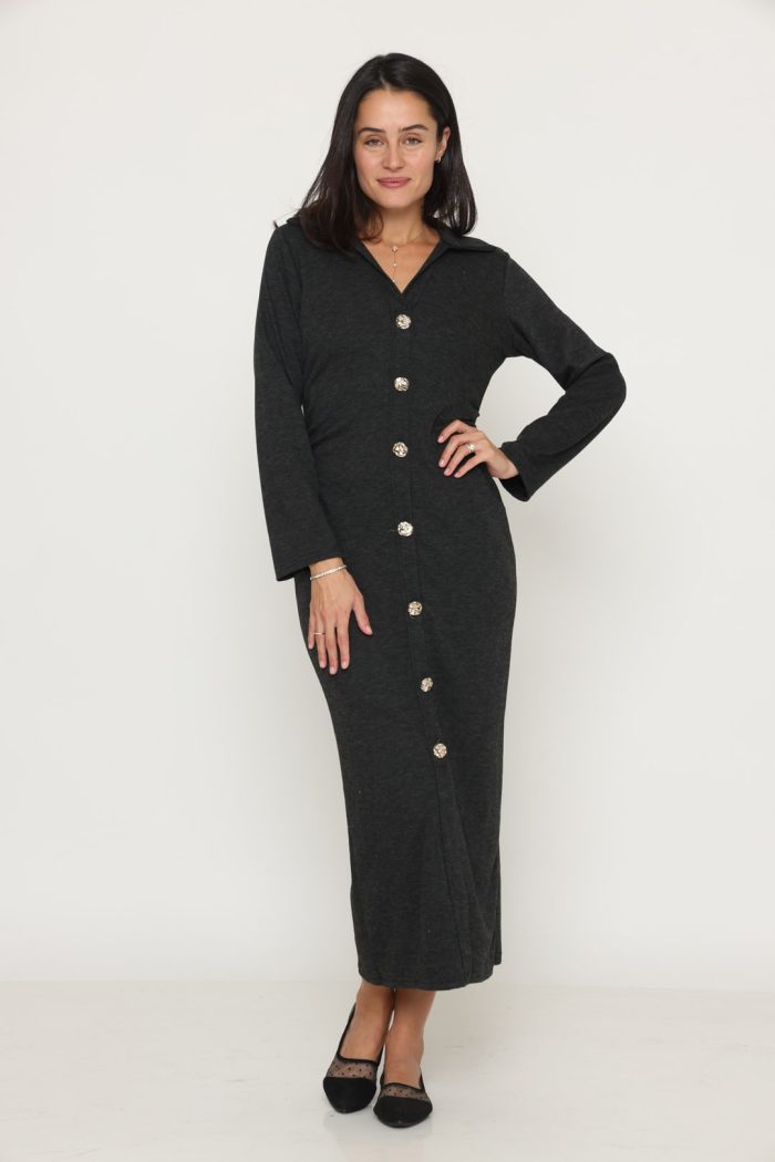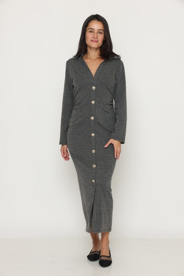 שמלה סריג מקסי כפתור זהב אפורה