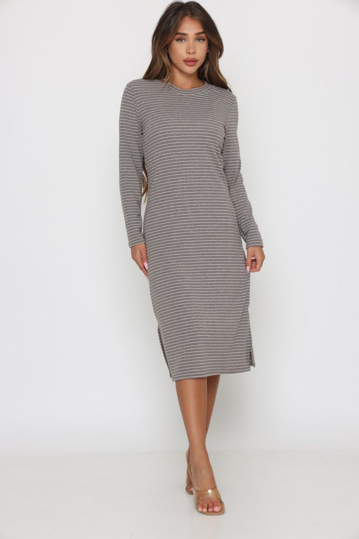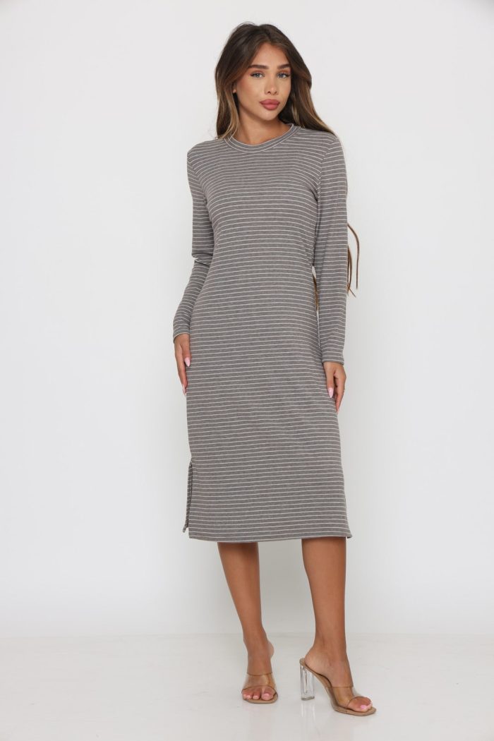 שמלה סריג פסים שילוב חגורה אפור