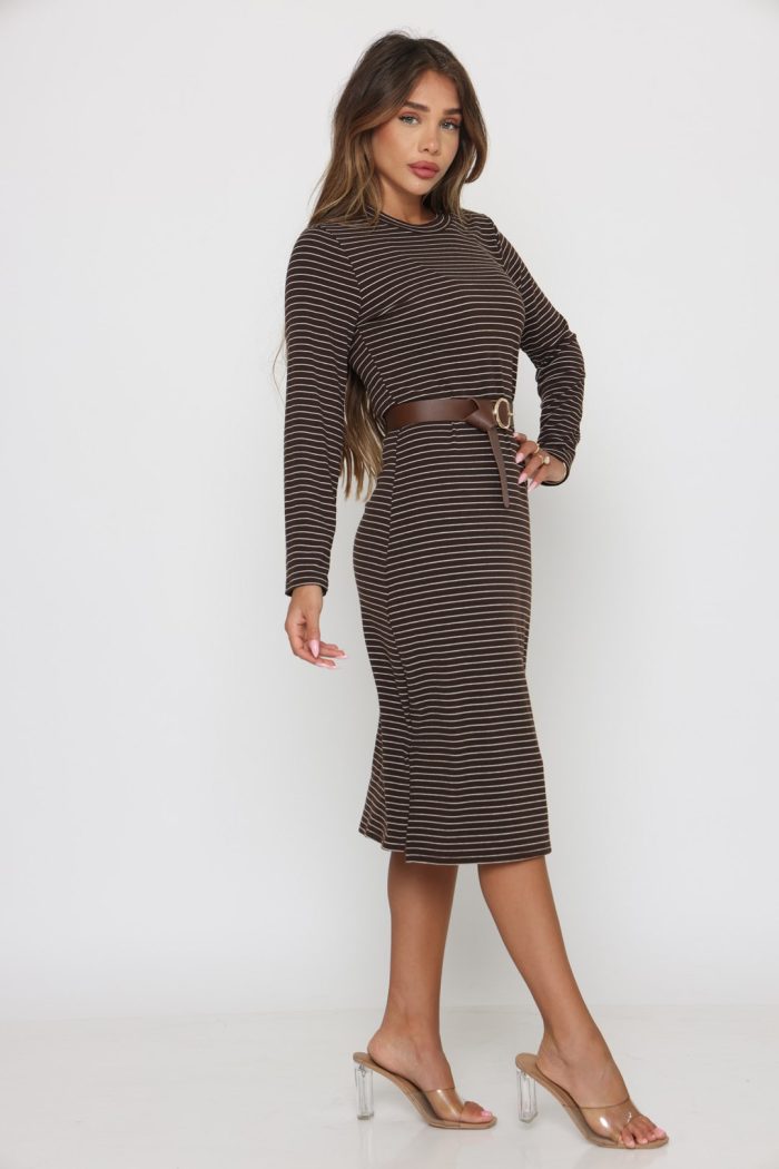 שמלה סריג פסים שילוב חגורה חום