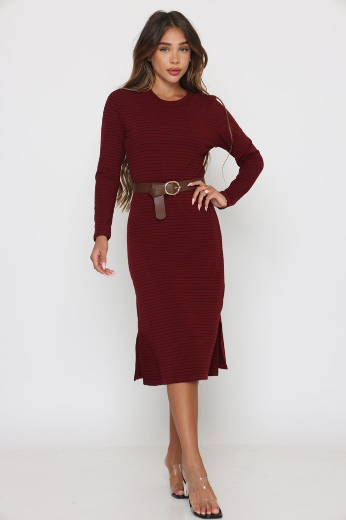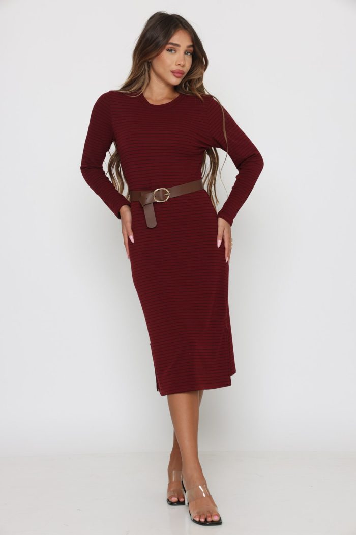 שמלה סריג פסים שילוב חגורה יין