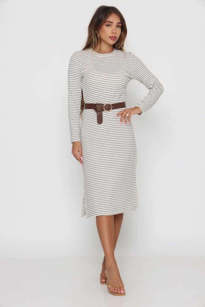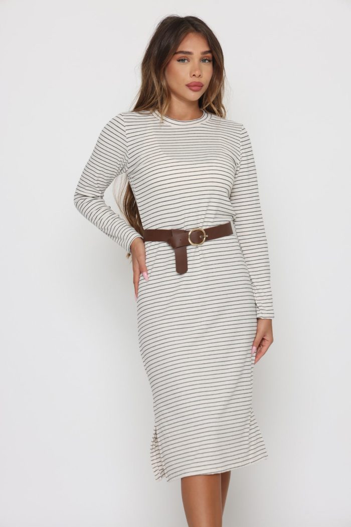 שמלה סריג פסים שילוב חגורה לבן